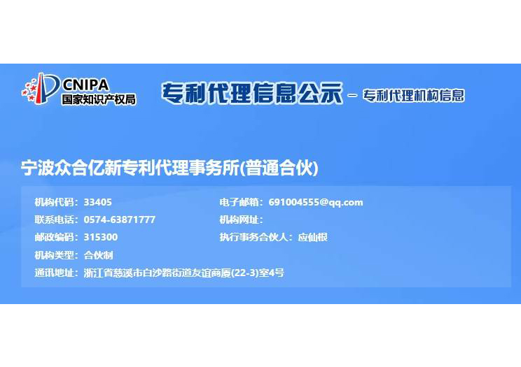 浙江億新知識產(chǎn)權服務有限公司前身為慈溪眾合知識產(chǎn)權代理事務所,創(chuàng)始于2004年,為了服務更多的創(chuàng)新企業(yè),實現(xiàn)“服務億萬創(chuàng)新企業(yè)”的理念,后更名為浙江億新知識產(chǎn)權,旗下公司包括:寧波眾合億新專利代理事務所(機構代碼33405)、中范(北京)認證有限公司。其中寧波眾合億新專利代理事務所是慈溪市科技服務聯(lián)盟理事單位,前灣區(qū)知識產(chǎn)權工作站。公司位于浙江省慈溪市文化商務區(qū)友誼商廈,并在北京、青島設有辦事處。